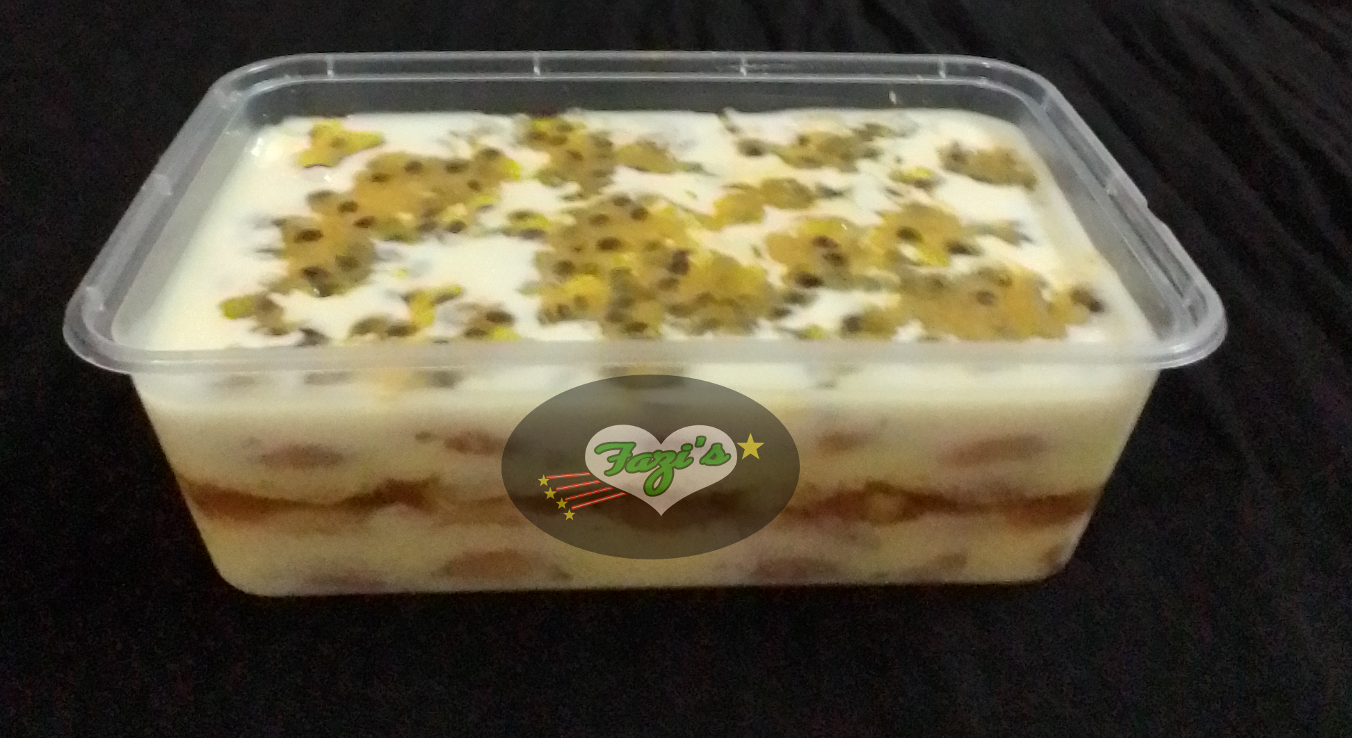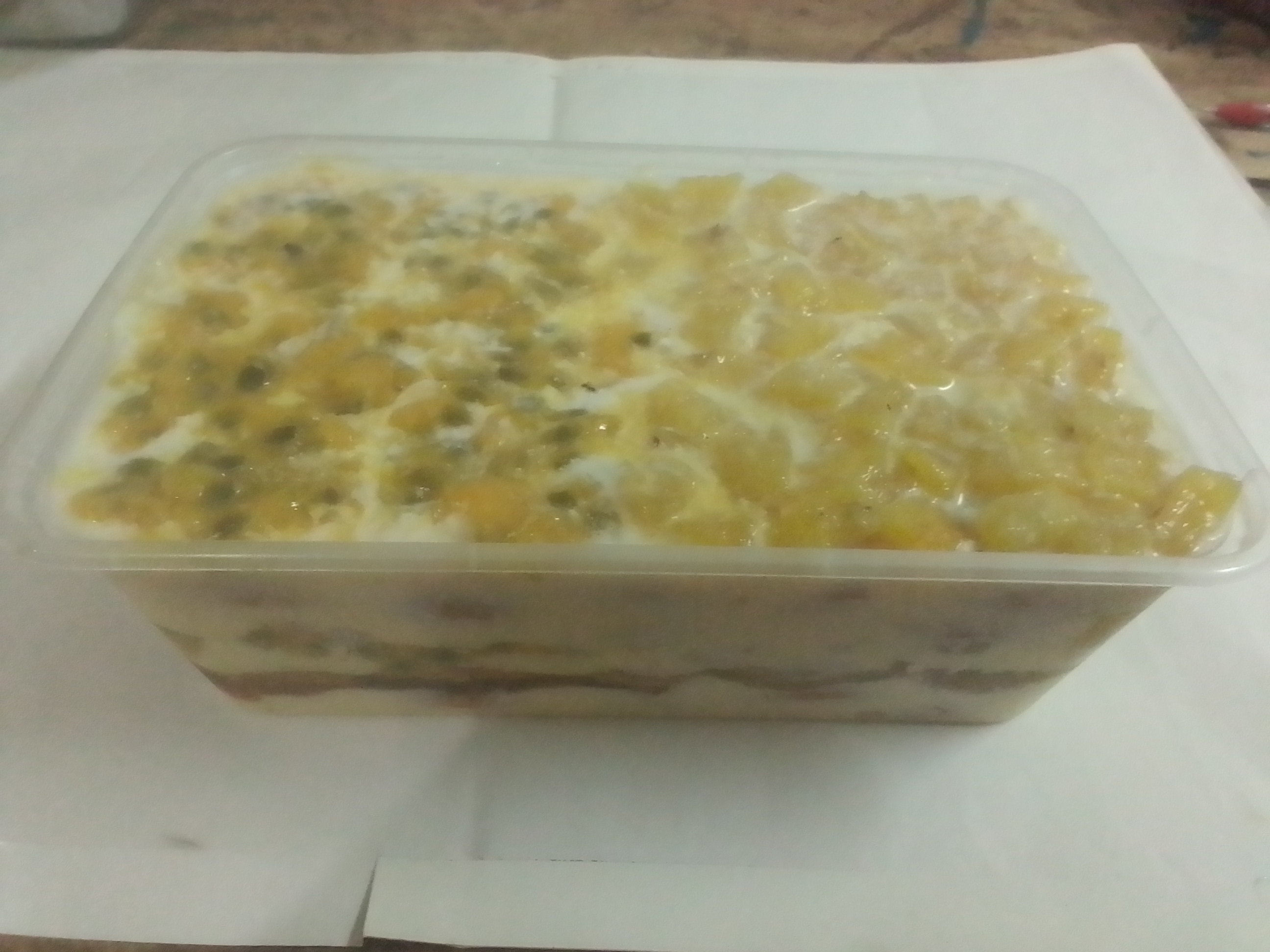 Biscuit Pudding with Half passion fruit and Half pineapple.